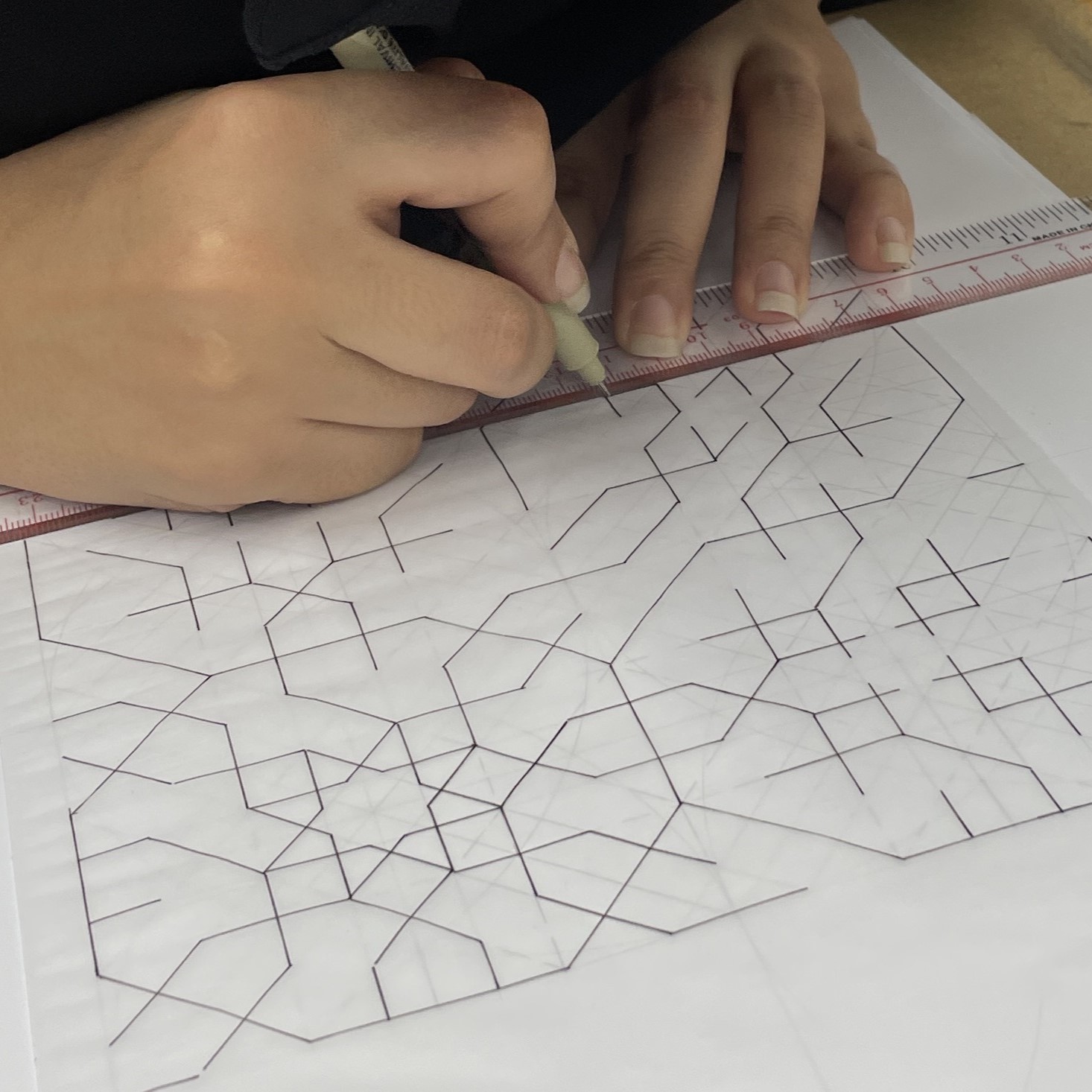 The second level of geometry courses develops the students’ drawing skills and understanding of pattern construction and composition. Students will extend their investigations into symmetry families derived from of the square root 2 and square root 3 proportions, as well as the basic Golden Mean grids.